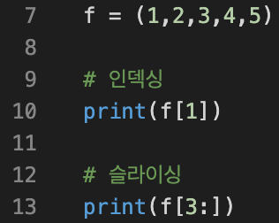 리스트 자료형과 동일하게 인덱싱과 슬라이싱을 사용할 수 있다.