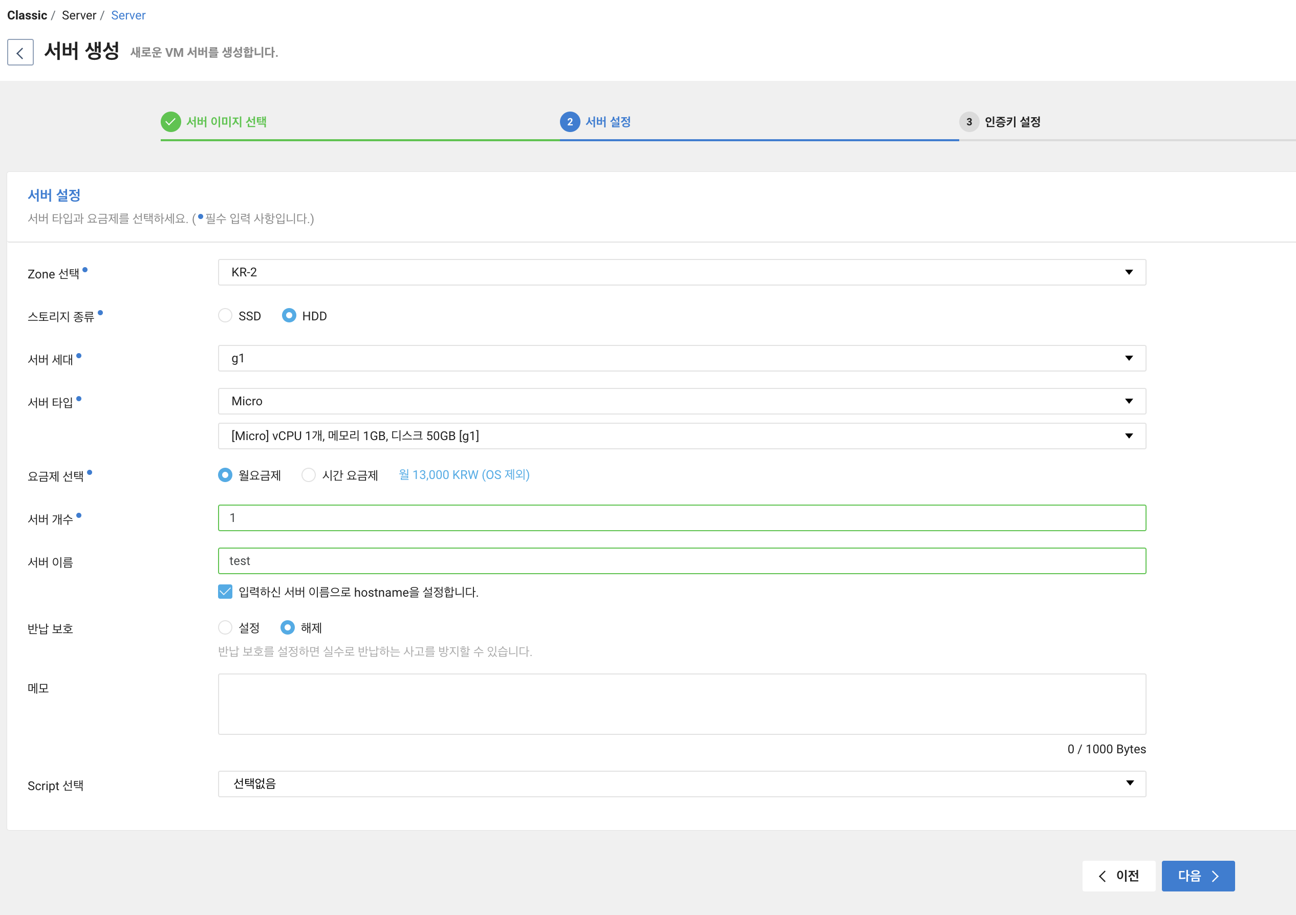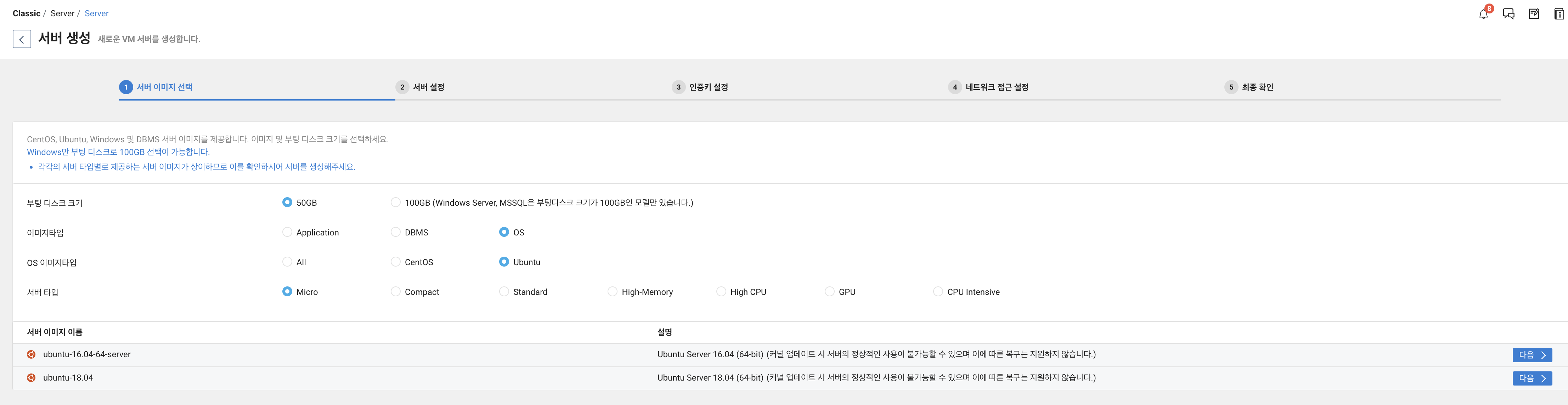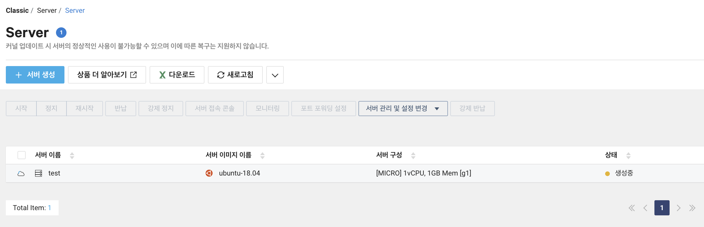 Platform 옆에 토글 버튼을 Classic으로 바꿔주고 서버 생성을 누르면 아래와 같은 화면이 나온다.