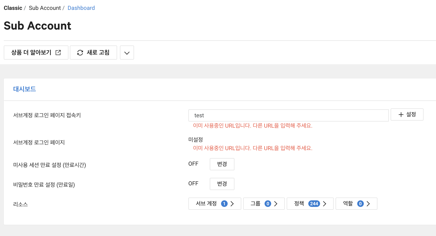 먼저 Dashboard에서 서브계정 로그인 페이지 접속키를 추가해준다.